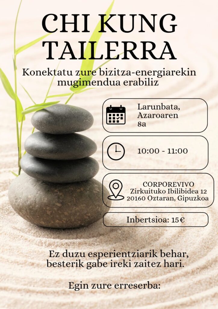 Azaroaren 8an, larunbata, egingo dugu Chi Kung Tailerra CORPOREVIVO zentroan, mugimendua, arnasketa eta kontzientzia lantzen dituen ariketa-antzinako praktikaren bidez gorputza, burua eta bizi-energia harmonizatuz.