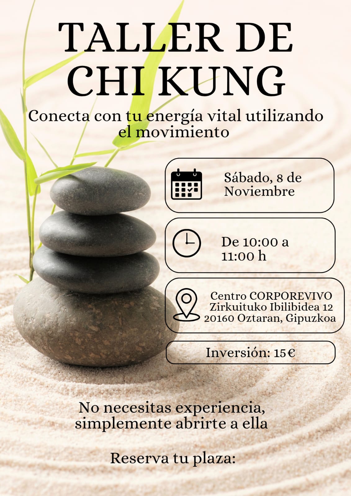 El próximo sábado 08 de noviembre realizaremos un Taller de Chi Kung en el centro CORPOREVIVO, una práctica ancestral que combina movimiento, respiración y atención plena para armonizar cuerpo, mente y energía vital.